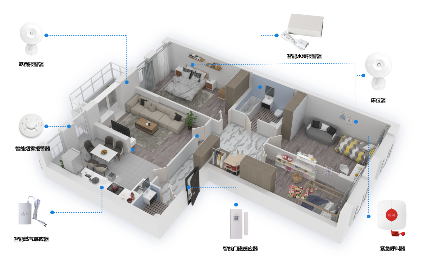 安裝在老年人臥室、客廳、衛(wèi)生間等區(qū)域,用于老人發(fā)生緊急情況時進行主動報警